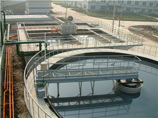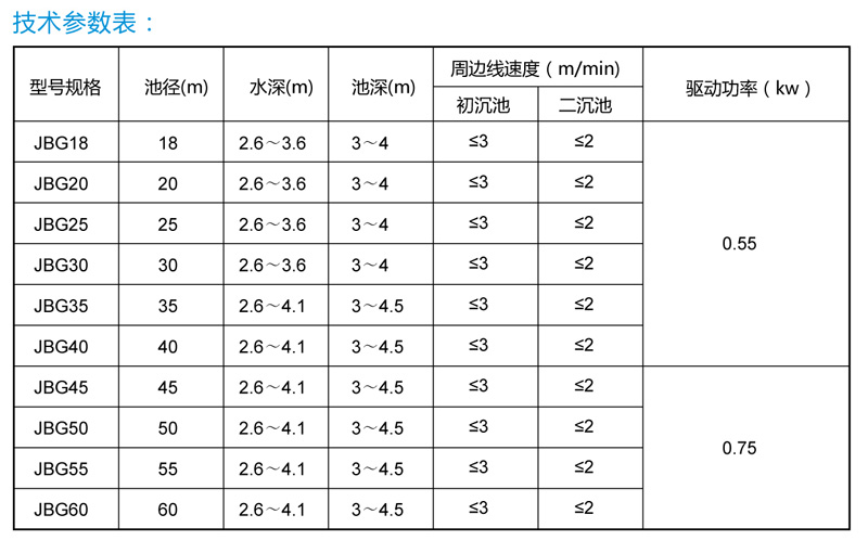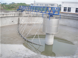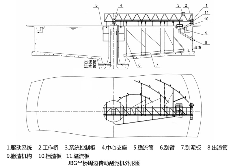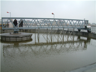 工作橋由安裝在周邊的驅(qū)動機(jī)構(gòu)帶動,繞安裝在池中心支墩上的中心支座旋轉(zhuǎn),安裝在工作橋的一組刮泥板在旋轉(zhuǎn)過程中,將沉降在池底的污泥刮向池中心的集泥坑。同時,液面上的浮渣在在浮渣刮板和周邊擋堰形成的漸縮區(qū)域內(nèi)集中,由浮渣刮耙扒到集渣斗,排出池外。