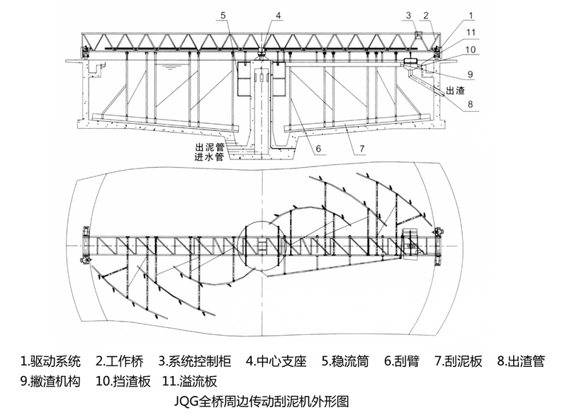 單軌刮泥機(jī)適用于污水處理廠幅流式二次沉淀池。其主要功能是將沉降在池底的污泥刮集至一組半徑方向布置的吸泥管管口,再通過(guò)中心排泥管排出,以便污泥回流或濃縮脫水。視情況需要,還可以設(shè)置池面刮渣機(jī)構(gòu),收集池面浮渣并通過(guò)浮渣漏斗排出池外。